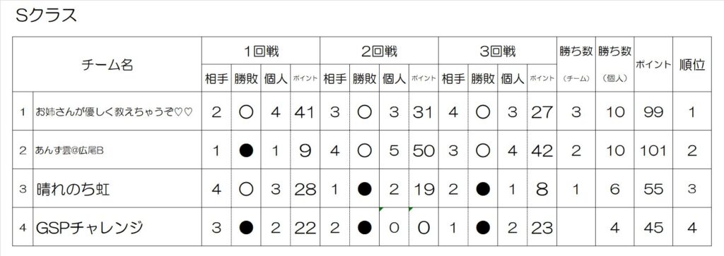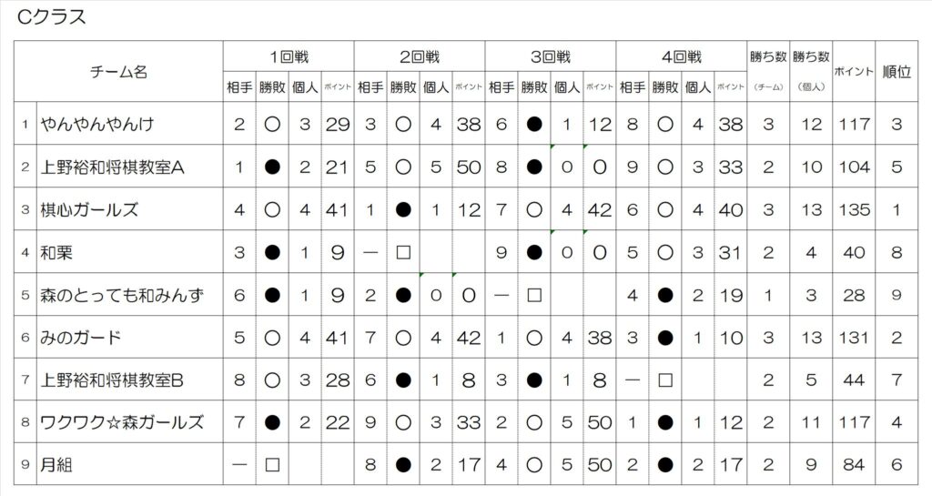 ・Cクラス(初心者) 初参加3名以上、初段以上不可 12ポイント以下